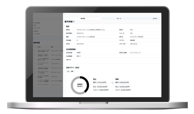 顧客情報、案件のフェーズや受注確度、見込み・実績の売上・利益といった情報を一つの画面で管理。担当者や関係者はいつでも正確な情報を確認でき、報告業務の負担を大幅に削減できます。